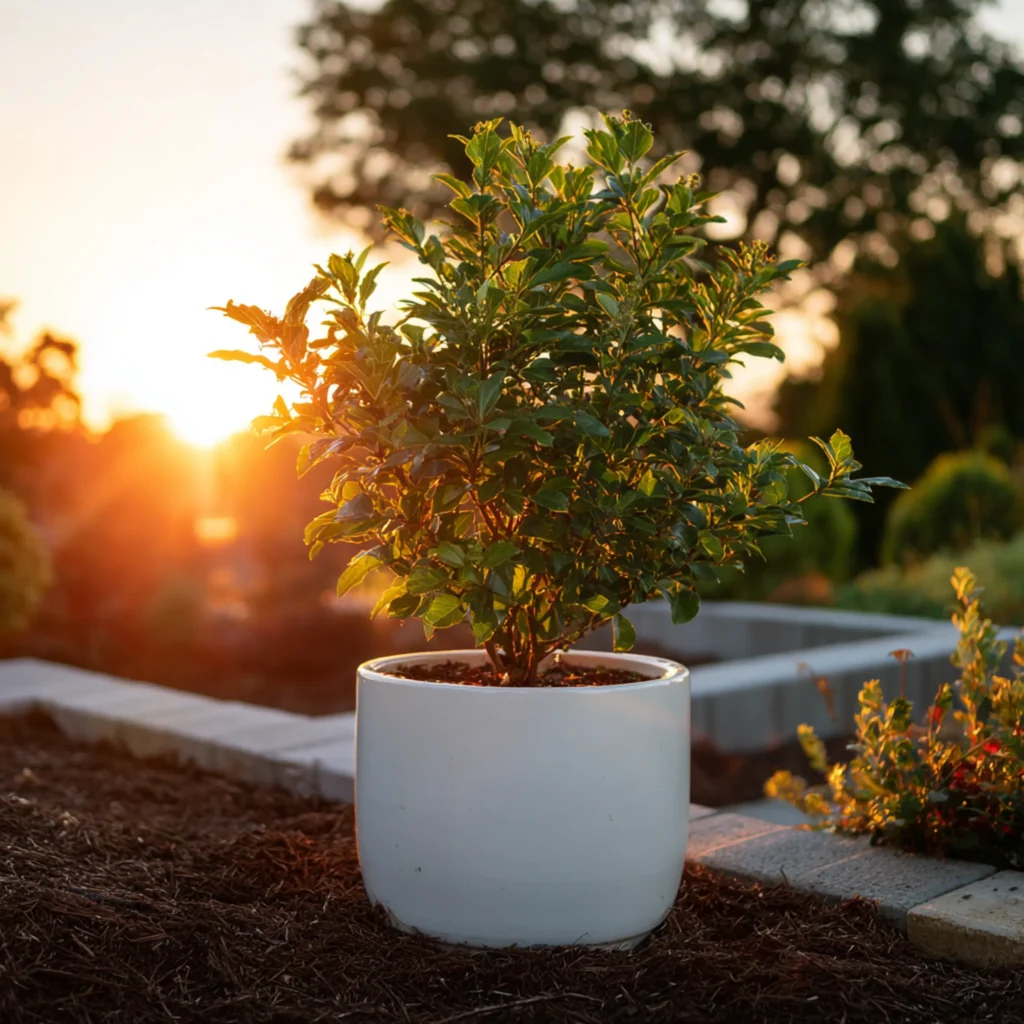 Καλλωπιστικό αειθαλές φυτό με λαμπερά, σκουροπράσινα φύλλα και λευκά αρωματικά άνθη. Ιδανικό για φράκτες και αστικές φυτεύσεις, χάρη στην ανθεκτικότητά του και την πυκνή του βλάστηση. Προσαρμόζεται εύκολα και διατηρεί τη μορφή του με ελαφρό κλάδεμα.